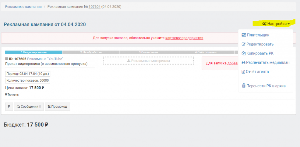 отредактировать медиаплан нажмите настройки и редактировать.